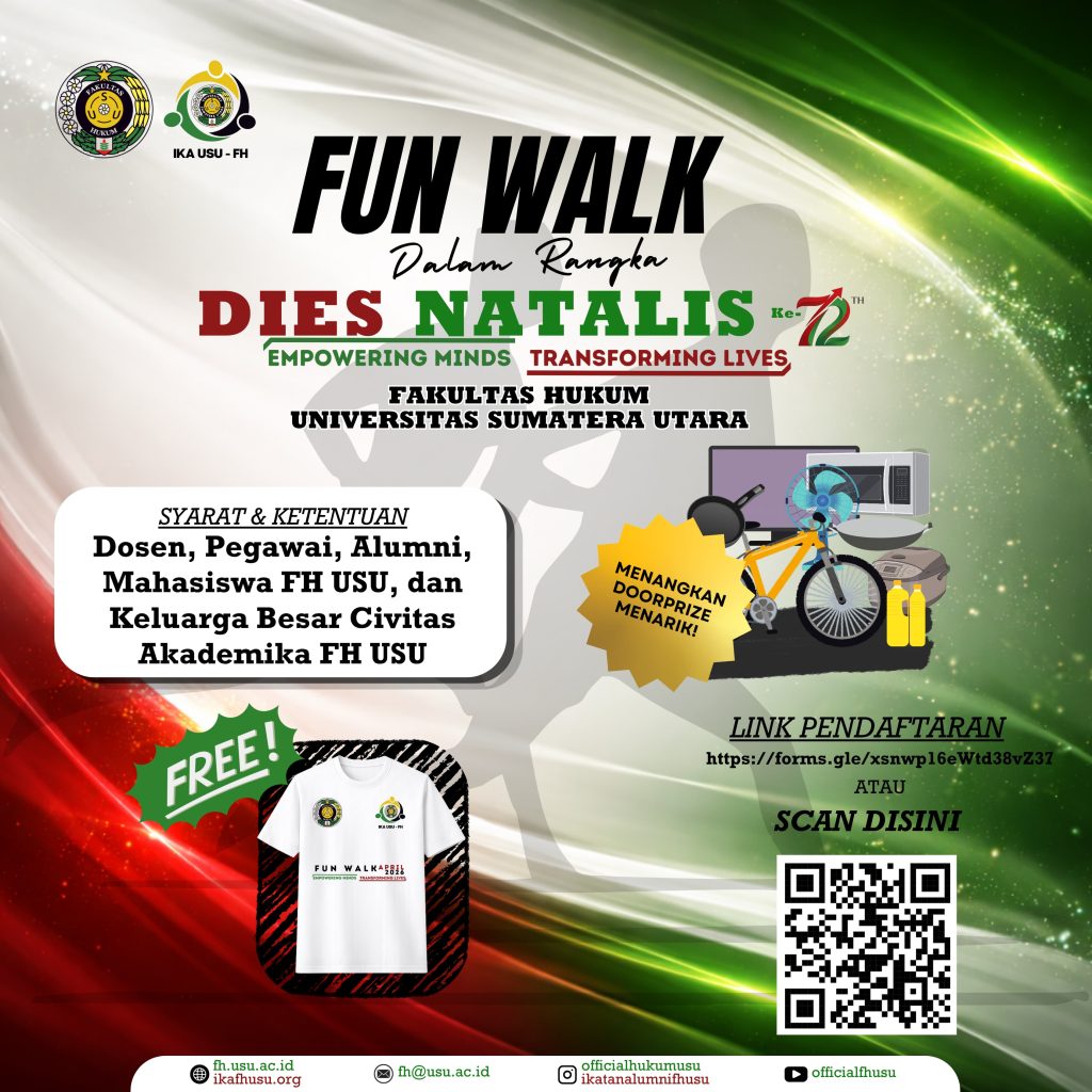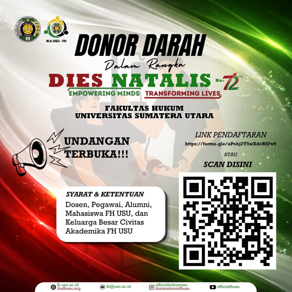 Medan — Fakultas Hukum Universitas Sumatera Utara (FH-USU) bersama Ikatan Alumni Fakultas Hukum Universitas Sumatera Utara (IKA FH USU) akan menggelar kegiatan Fun Walk dan donor darah dalam rangka memeriahkan Dies Natalis ke-72 Fakultas Hukum Universitas Sumatera Utara.